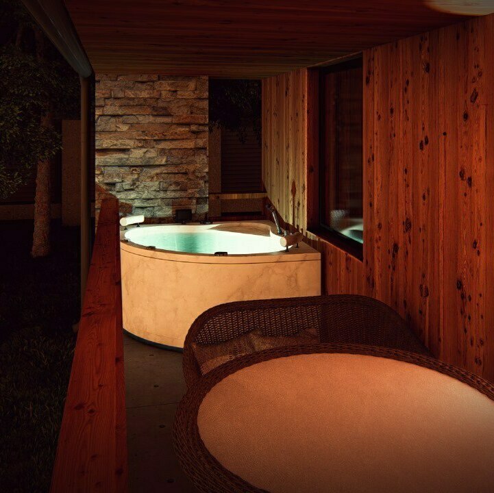 Парная с полоками, сенным столом для парения и дровяной печью. Подогреваемый бассейн, чан с горячей водой на дровах и купель с ледяной водой.